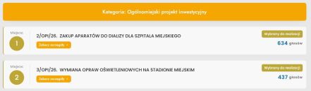 Pierwsze miejsce w tej kategorii zajął projekt nr 2 "Zakup aparatów do dializy dla szpitala miejskiego", który uzyskał 634 głosy, a którego celowości oczywiście nie sposób podważyć. Poza tym, z pozostałych kategorii, przyjętych do realizacji zostało 21 innych projektów.