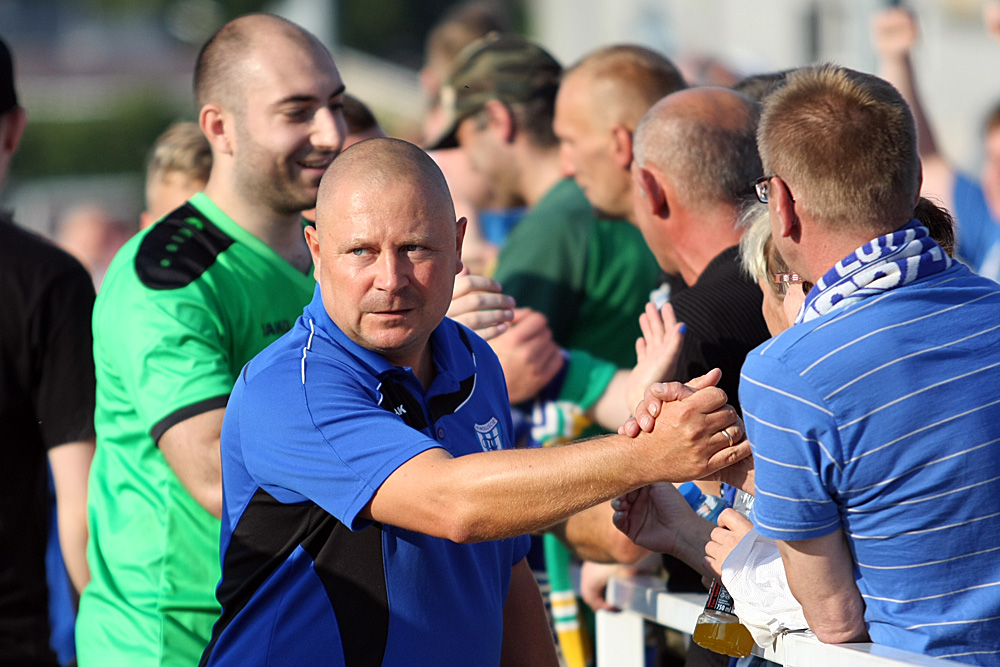 Tomasz Brzozowski. Jeżeli wygrywa się po bramce w 93 minucie z zespołem mającym swoją markę, to można się tylko cieszyć. Od pierwszej minuty staraliśmy się nie przestraszyć rywala, graliśmy agresywnie, wysoko, przez co trochę odpuszczałem defensywę. Mecz był bardzo ładny, oba zespoły mogły wygrać. Udało się nam, jest to mega sukces dla tej młodej drużyny, co da nam "kopa" do dalszej pracy i zawodnicy uwierzą, że mogą grać jak równym z równym ze wszystkimi. Po spadku z IV ligi część zawodników zrezygnowała, mamy wąską kadrę, postanowiliśmy odmłodzić skład. W dzisiejszym meczu nie było możliwości zrobienia więcej zmian, gdyż nasza młodzież nie jest jeszcze gotowa na taki mecz. Staramy się złapać jak najwięcej punktów na początku, jak będziemy ładnie grać, to na pewno przyciągnie to też zawodników z okolicy i będzie większa rywalizacja. Na razie gramy tym co mamy i w miarę to wygląda. W tym sezonie chcemy spokojnie pograć, bez presji, dając więcej szans wychowankom. Mimo porażki uważam Flotę za głównego - obok Chemika Police - faworyta do awansu, czego jej życzę, bo piłkarsko jest na pewno ponad tę ligę.
