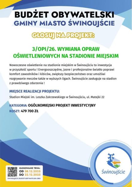 Miło nam obwieścić na zakończenie roku 2025, że zgłoszony do Budżetu Obywatelskiego miasta Świnoujścia na rok 2026 projekt "Wymiana opraw oświetleniowych na stadionie miejskim", oznaczony symbolem 3/OPI/26, uzyskując 437 głosów zajął w kategorii ogólnomiejski projekt inwestycyjny drugą pozycję i został wybrany do realizacji! Tym samym jest nadzieja, że już w przyszłym roku będziemy mogli oglądać mecze Floty w godzinach wieczornych, nawet w listopadzie.