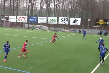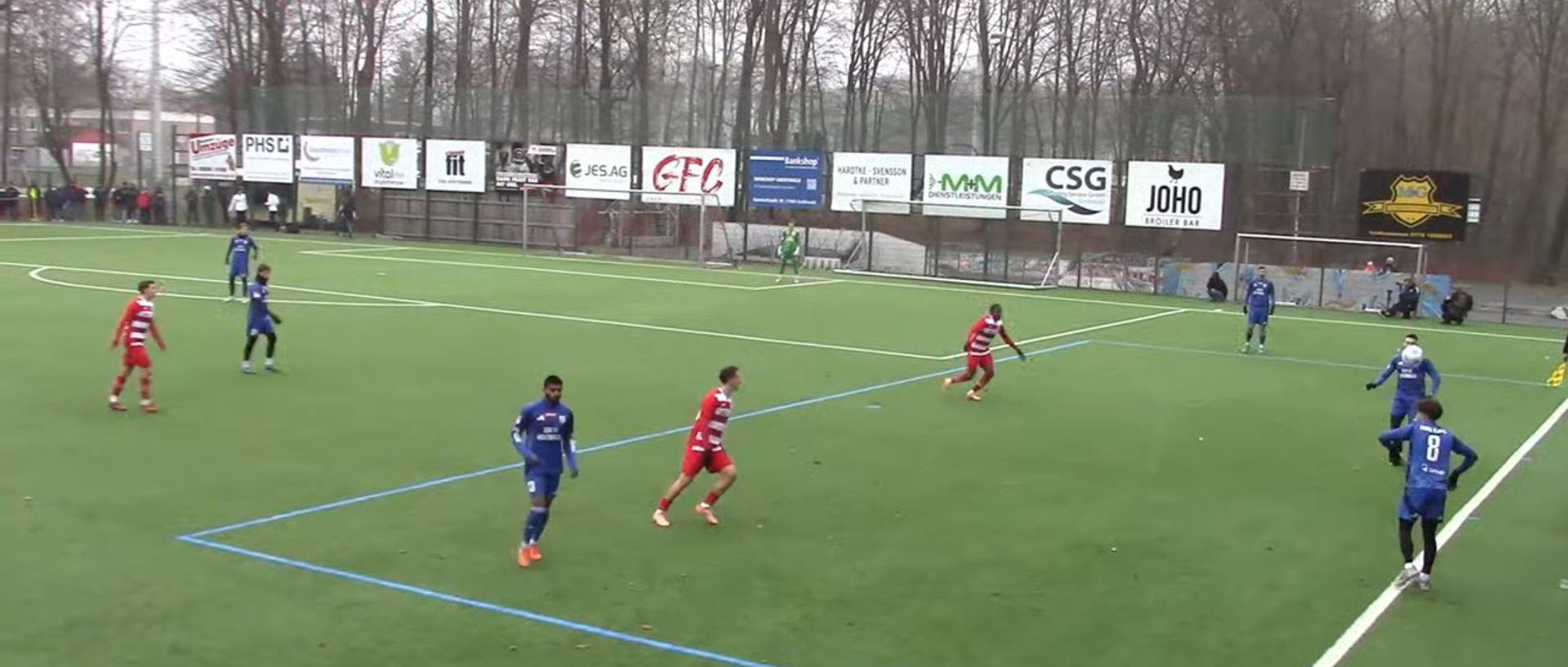 Na początku piłką operowali niemal wyłącznie gospodarze, ale większe zagrożenia z tego nie wynikały. W 24 minucie ostry strzał zza pola karnego intuicyjnie obronił Krzysztofek, ale niedługo potem bramkarz gospodarzy odbił równie niebezpieczny strzał Cybulskiego z narożnika pola karnego. W ostatniej minucie pierwszej połowy David Vogt z podbicia zdobył raczej niespodziewane w tym momencie prowadzenie dla drużyny niemieckiej.