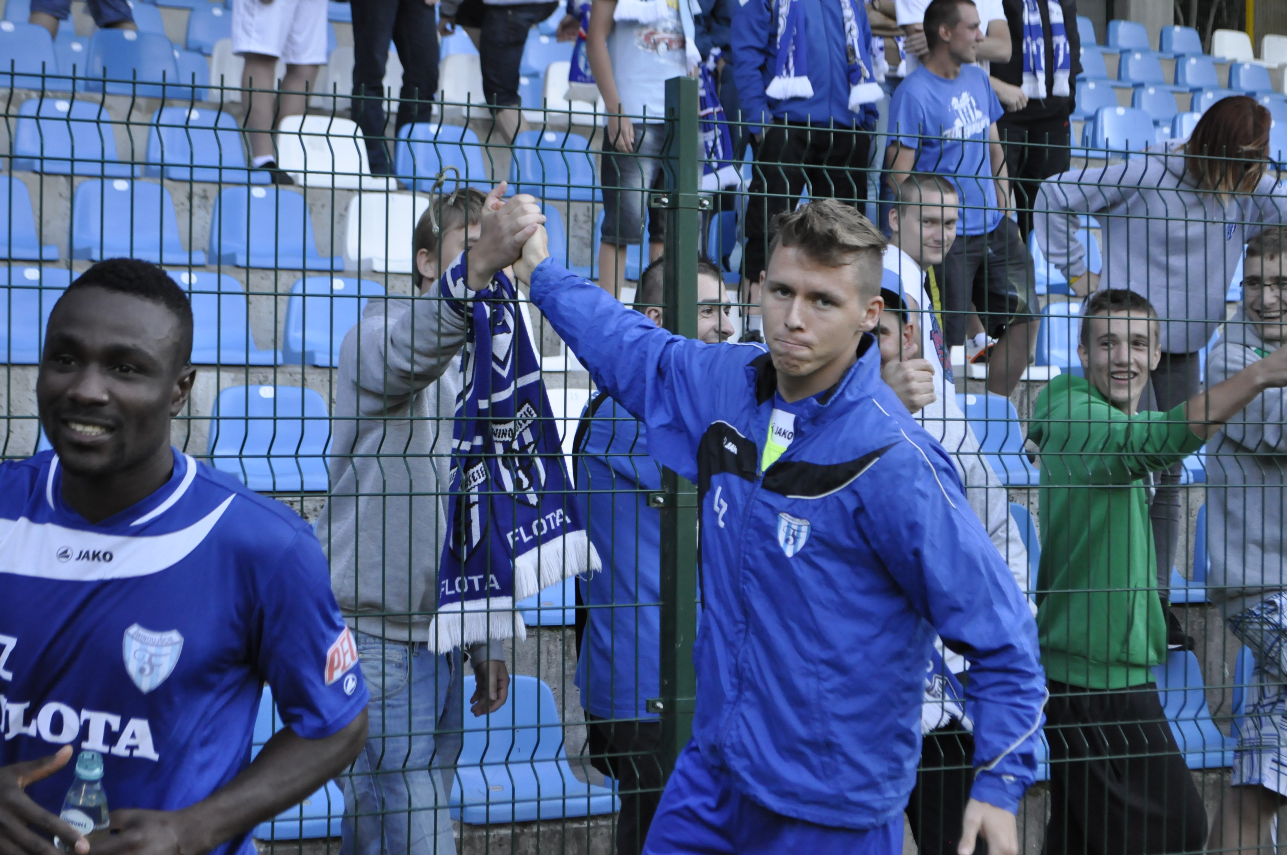 - Jeden za wszystkich, wszyscy za jednego! - krzyknęli sobie nasi piłkarze przed meczem. Jednak w pierwszej połowie nie przypominali zespołu. Rozpoczęło się optymistycznie: od strzału Sebastiana Kwiatkowskiego. Potem jednak rywale zaczęli coraz bardziej zagrażać obronie Floty. - Żyjemy! Żyjemy! - krzyczał bramkarz Wojciech Szurko, który wygrał w 16 minucie pojedynek sam na sam z rywalem. Niestety, jeszcze w tej samej minucie gospodarze objęli prowadzenie.